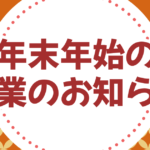 - 年末年始の営業のお知らせ年末年始の営業時間については下記のとおりとなっております 年末は12月30日(金曜日)まで通常営業新年は1月6日(金曜日)より通常営業となります。 営業時間は 10:00~18:00(日曜・木曜定休)となっております。 […]